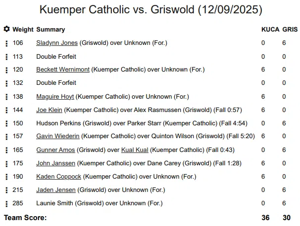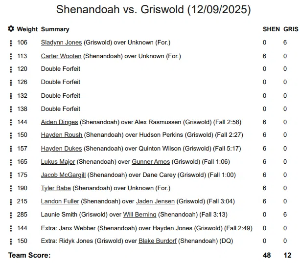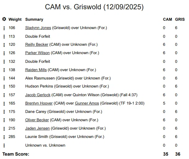 Griswold was led by Launie Smith who won his only match by fall at 3:13. Hudson Perkins was 1-1 with a fall. Gunner Amos was 1-2 with a fall in 43 seconds.