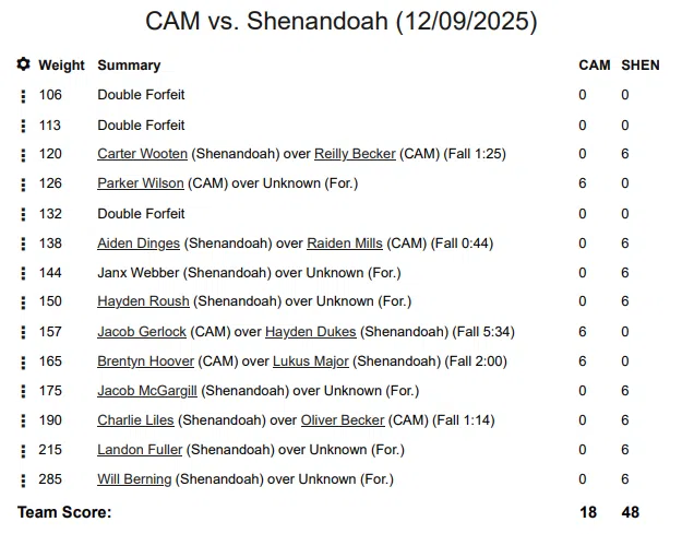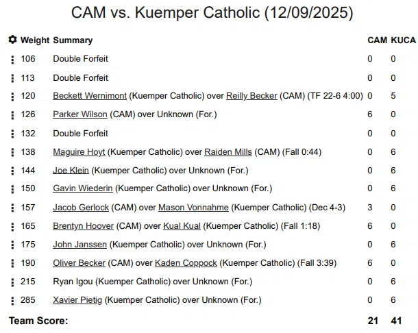 CAM had undefeated nights from Brentyn Hoover who was 3-0 with 2 falls and a tech fall and Jacob Gerlock was 3-0 with 2 falls and a 4-3 win. Oliver Becker went 1-1 with a fall.