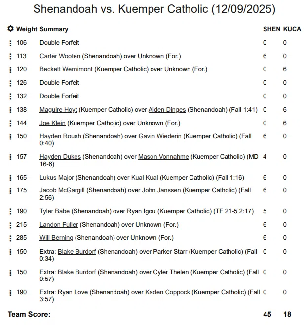 (Anita, IA) — CAM hosted a boys wrestling quad on Tuesday with Griswold, Kuemper Catholic and Shenandoah. The Mustangs were the winners going 3-0 beating KC 45-18, beating CAM 48-18 and beating Griswold 48-12. The Knights beat CAM 41-21 and beat Griswold 36-30 to go 2-1. Griswold got the win over CAM 36-35.