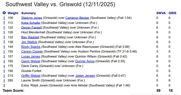 For Southwest Valley, Brody Sparks was 2-0 with 2 falls, Carson Cooper was 2-0 with a fall and tech fall, Gavin Wetzel was 2-0 with 2 falls, Griffin Wetzel was 2-0 with 2 falls — both in 47 seconds.