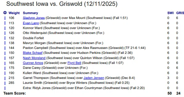 For Griswold, Sladynn Jones was 2-0 with 2 falls and Launie Smith won his only match by fall in 25 seconds.