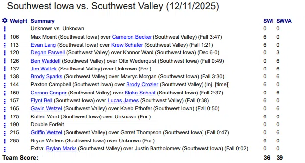 (Sidney, IA) — Southwest Iowa, Southwest Valley and Griswold competed in a triangular and the Timberwolves went 2-0. SWV beat Griswold 59-18 and beat Southwest Iowa 39-36. SW Iowa beat the Tigers 50-24.