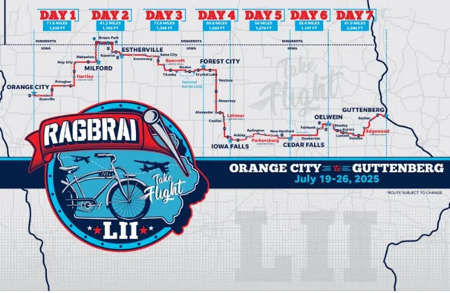 The journey begins today in Orange City, with riders pedaling 71 miles to Milford. On Day 2, the route briefly crosses into Minnesota before ending in Estherville on Monday night. From there, cyclists will cover nearly 74 miles to Forest City on Tuesday, 69.8 miles to Iowa Falls on Wednesday, 50 miles to Cedar Falls on Thursday, and 38.4 miles to Oelwein on Friday. The ride wraps up Saturday with a 61.6-mile trek to the Mississippi River town of Guttenberg.