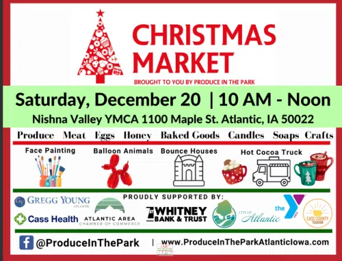 (Atlantic) Produce in the Park's Christmas Market will be held this Saturday, December 20, from 10:00 AM - Noon at the Nishna Valley Family YMCA (1100 Maple St., Atlantic, IA 50022). Produce in the Pa...