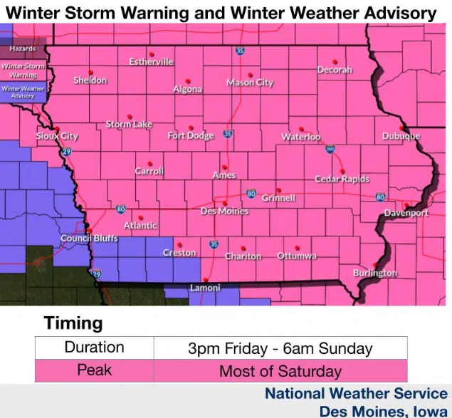 (Des Moines) A Winter Storm Warning is in effect from 3 p.m. Friday through 6 a.m. Sunday, with forecasters calling for heavy snowfall and dangerous travel conditions across western and central Iowa. ...