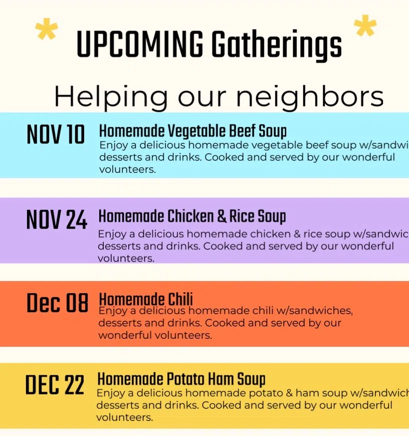 Helping Our Neighbors is a semi-regular event where neighbors can gather for fellowship and a free meal. The event will be held at 201 Poplar in Atlantic from 5-7pm. Click to learn which meals are being served on specific dates.