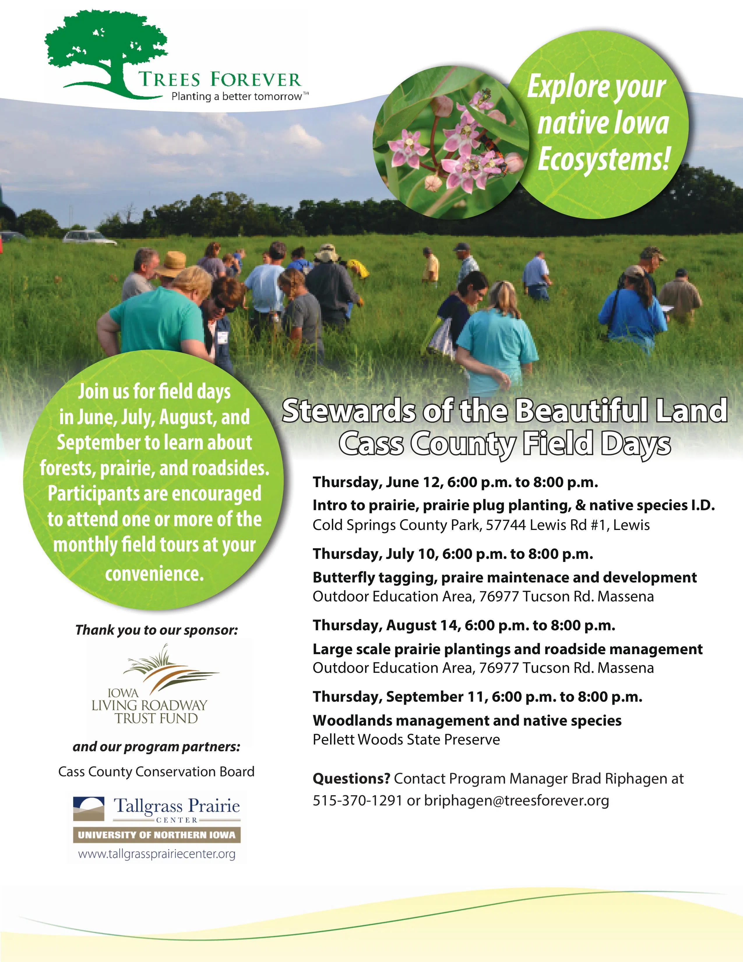 Cass County Conservation and Trees Forever are hosting an “Intro to Prairie and Plant ID” prairie walk on Thursday, June 12th starting at 6:00 pm out at Cold Springs County Park. Cass County Naturalist Lora Kanning will lead the tour and you can even get your hands dirty helping with a small planting after. More information on the Trees Forever website or the Cass County Conservation Board website and more field days are scheduled in Cass County for July 10th, August 14th and September 11th .