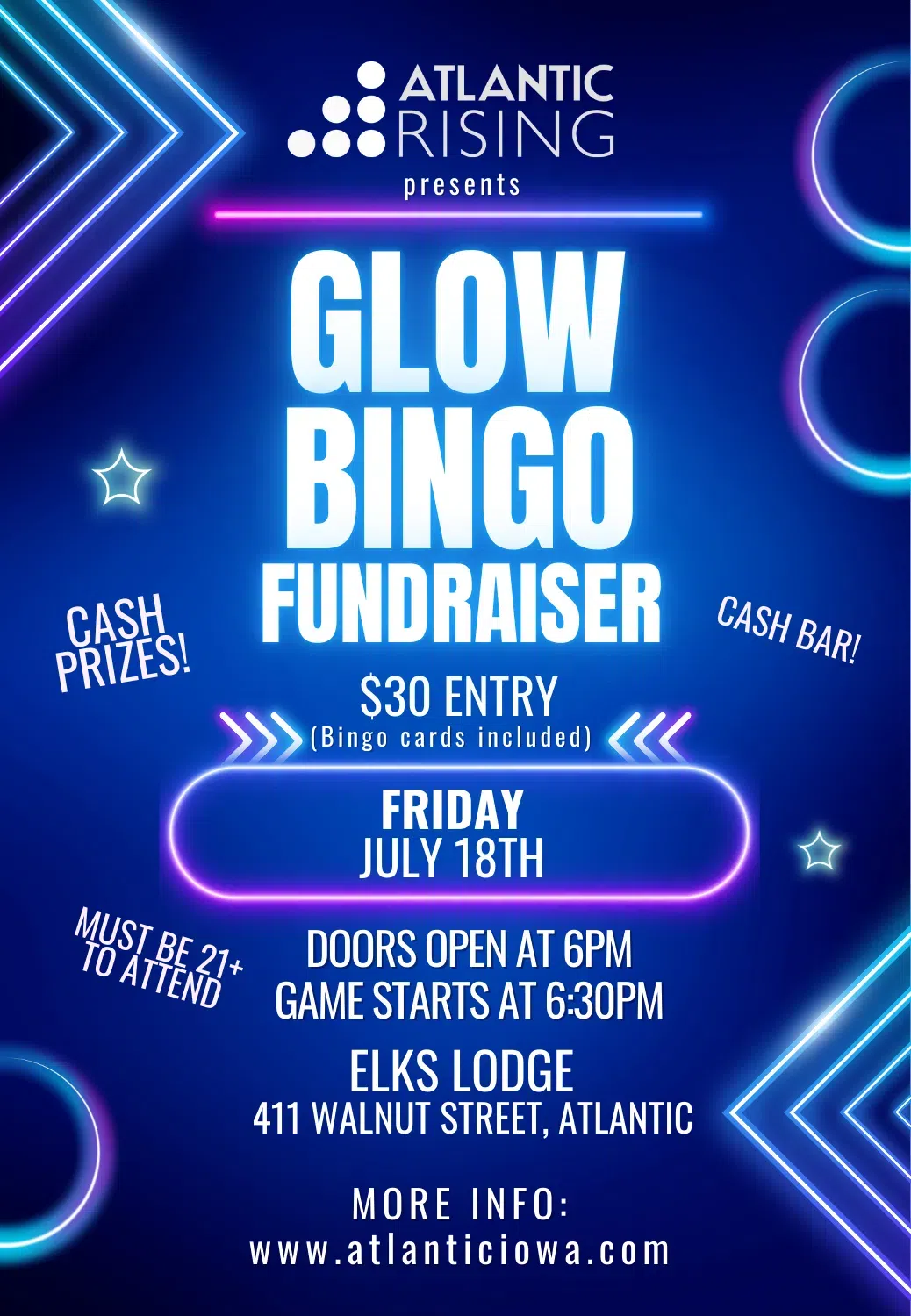 Get Ready to GLOW for a Great Cause! ? Atlantic Rising presents GLOW BINGO, a night of neon lights, fun, and prizes all for a great cause! ✨ ? Friday, July 18th ? Elks Lodge | 411 Walnut Street, Atlantic ? Doors open at 6 PM | Bingo kicks off at 6:30 PM ?️ $30 entry (includes your Bingo cards!) ? Cash bar all night ? Cash prizes up for grabs! Come out and support Atlantic Rising’s Christmas Box Program, which brought holiday meals to over 170 households in Cass County last year. Let’s light up the night and do it again—bigger and brighter! ? Must be 21+ to attend ? Questions? Contact Kelsey at 712-243-3017 or Kelsey@atlanticiowa.com Let’s B-I-N-G-O and G-L-O-W! ??