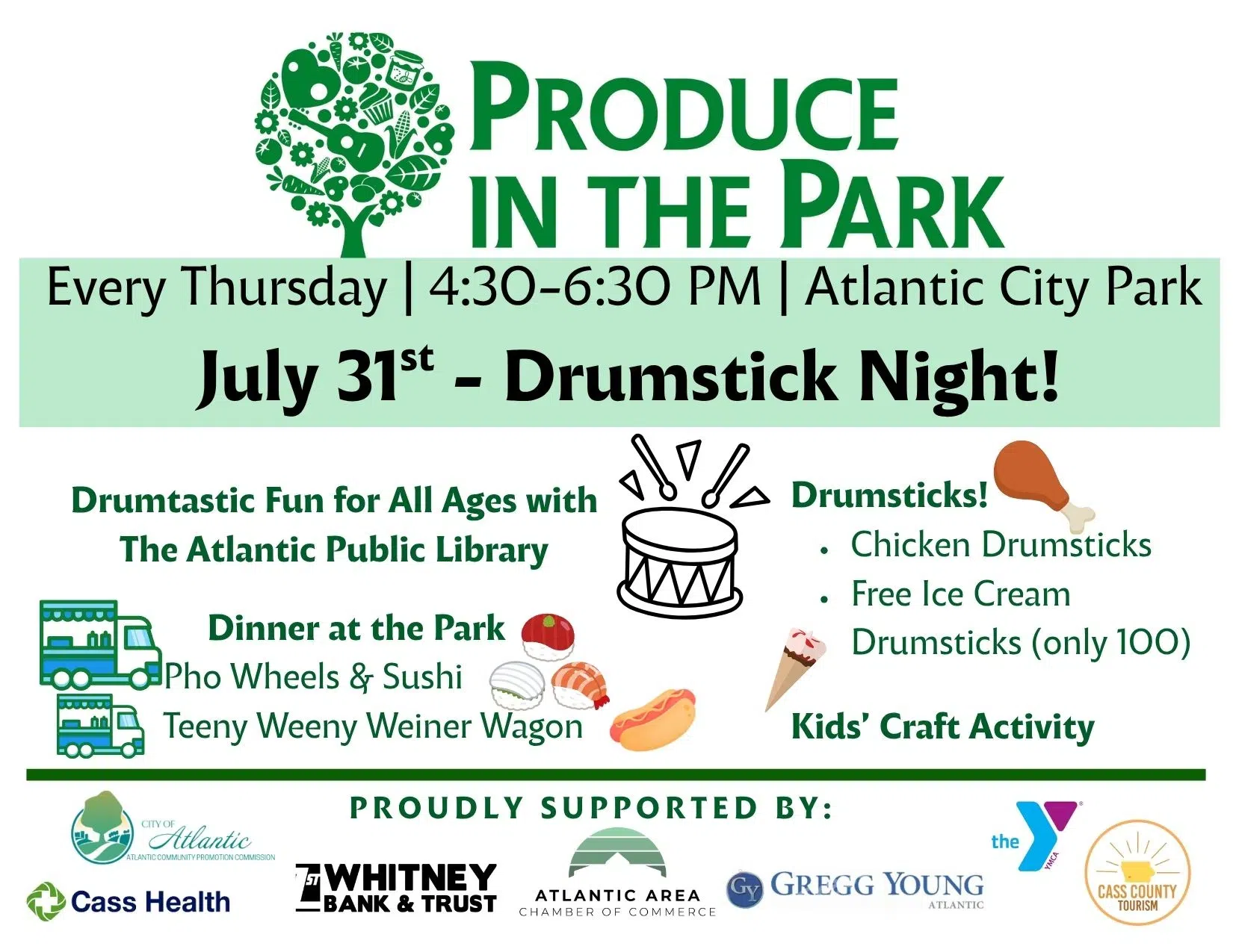 It’s Drumstick Night at Produce in the Park! Join us for a Drumtastic time with the Atlantic Public Library’s all-ages drumming activity! We’ll be featuring chicken drumsticks from a local vendor, and Cass County Tourism is giving away 100 ice cream drumsticks, first come, first served! 25+ Vendors: Fresh Produce (tomatoes, cucumbers, sweet corn, green beans, and more), Farm-Fresh Eggs, Local Meats (including chicken drumsticks!), Baked Goods & Desserts, Freeze-Dried Snacks, Local Honey, Arts & Crafts, Garden Decorations, Compost Food Trucks: Pho Wheels and Sushi, Teeny Weeny Weiner Wagon Kids' craft activity, accordion tunes, and Visiting organizations: Healthy Cass County, Cass Health, Atlantic Kiwanis, and more! Facebook event link: https://www.facebook.com/share/1HxDwrhn5k/