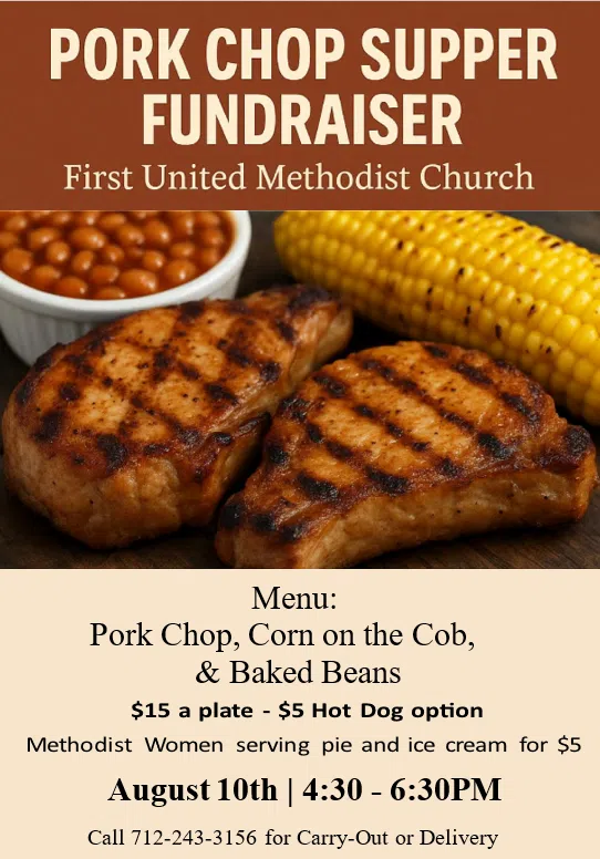 FIRST UNITED METHODIST ATLANTIC MEN'S CLUB HOST AN ANNUAL PORK CHOP DINNER. MENU: PORK CHOPS, CORN ON THE COB, BAKED BEANS, FOR $15, HOT DOG OPTION $5 -WOMEN'S GROUP SERVES PIE & ICE CREAM FOR $5. FUNDS USED FOR GROUP'S COMMUNITY SERVICE PROJECTS AND CHURCH PROJECTS .